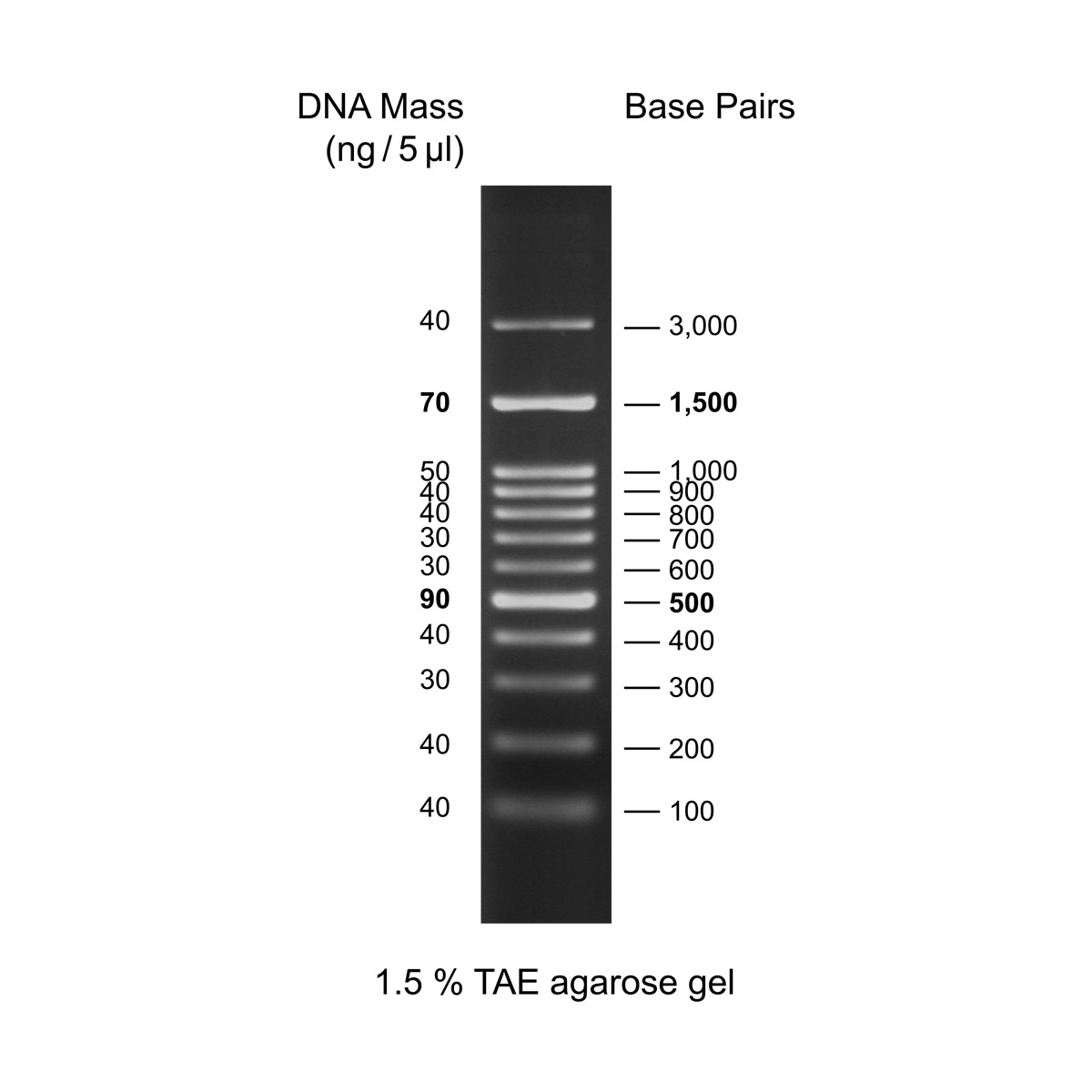 A unique combination of PCR products and a number of proprietary plasmids digested with appropriate restriction enzymes to yield 12 fragments, suitable for use as molecular weight standards for agarose gel electrophoresis. The DNA includes fragments ranging from 100-3,000 base pairs. The 500 and 1,500 base pair bands have increased the intensity to serve as reference points. The approximate mass of DNA in each band is provided (0.54 μg a load) for approximating the mass of DNA in comparably intense samples of similar size.