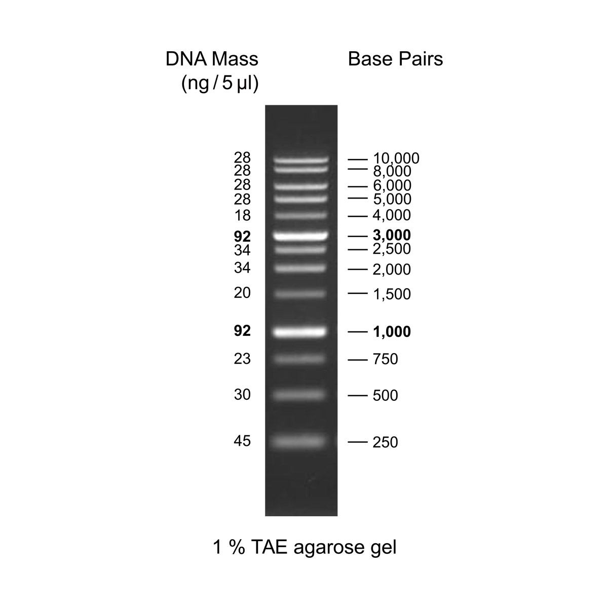 A unique combination of a number of proprietary plasmids digested with appropriate restriction enzymes and PCR products to yield 13 fragments, suitable for use as molecular weight standards for agarose gel electrophoresis. The DNA includes fragments ranging from 250-10,000 base pairs. The 1K and 3K bands have increased the intensity to serve as reference points. The approximate mass of DNA in each band is provided (0.5 μg a load) for approximating the mass of DNA in comparably intense samples of similar size.