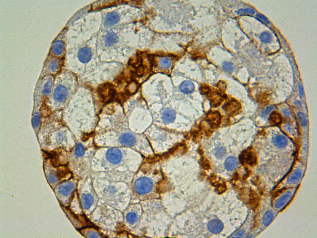 Spheroid from hepatocyte cell line was matured for 20 days prior to exposure to HCV. Infection spreading (rate) was controlled after 24, 48 and 72hours (brown staining)