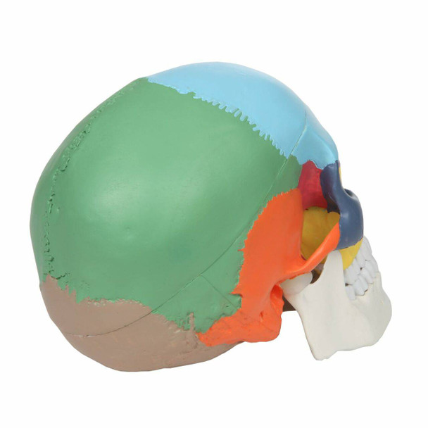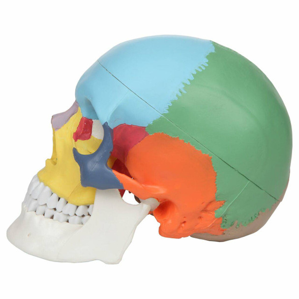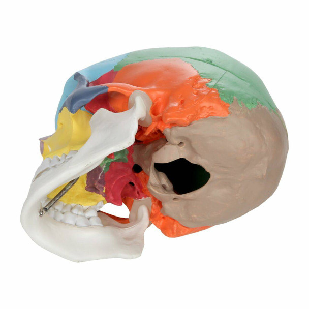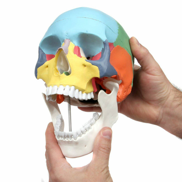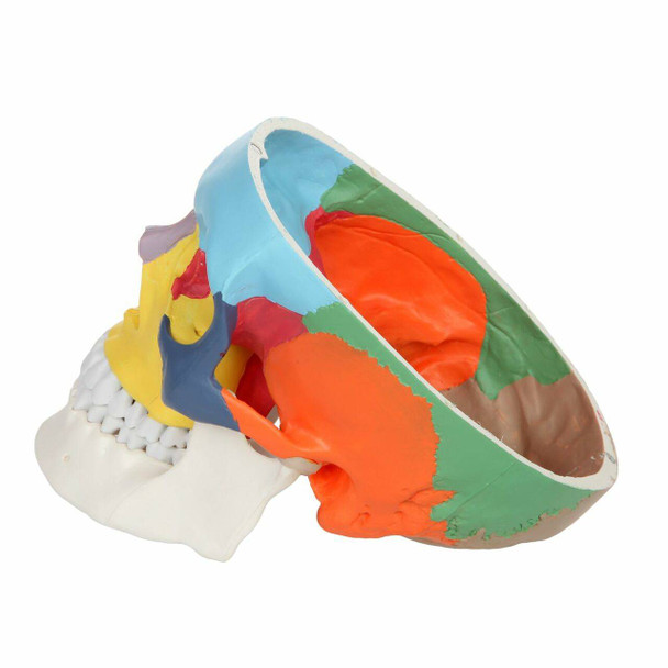 The Axis Scientific 3-Part Life-Size Didactic Human Skull Model is an anatomically accurate replica of the skull. Cast from a real human specimen, this model is the perfect color-coded tool to gain a deeper understanding of the skull's anatomy. The removable calvarium (skull cap) provides a full view of the skull’s internal features while the articulating mandible (jaw) offers a demonstration of its natural movements. Included with this didactic skull model is a highly detailed product manual that lists the 14 anatomical parts.
