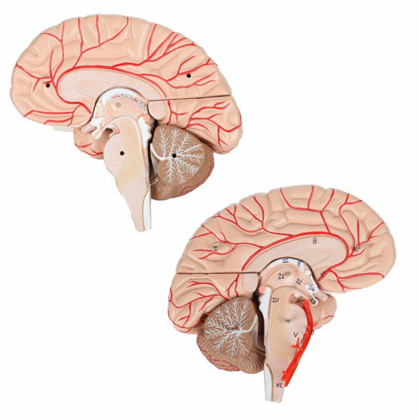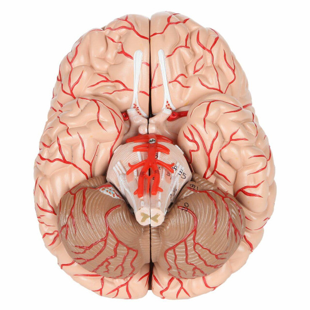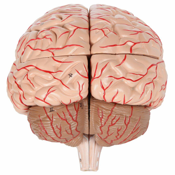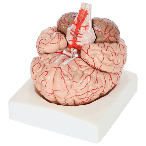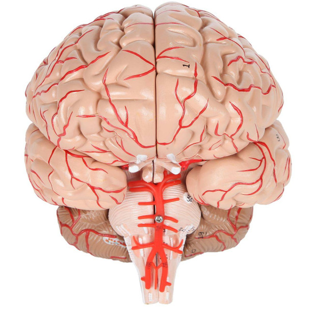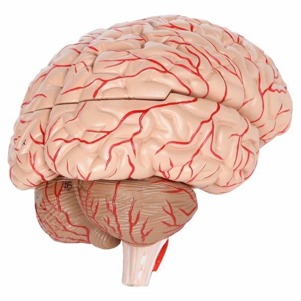 The brain can be easily disassembled into 8 pieces; Frontal and parietal lobes (2 pieces), temporal and occipital lobes (2 pieces), brain stem (2 pieces), and cerebellum (2 pieces). It also features an attached Circle of Willis and basilar artery. The model is held together with a unique combination of magnets and pegs, allowing for easy and intuitive reassembly.