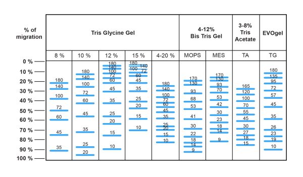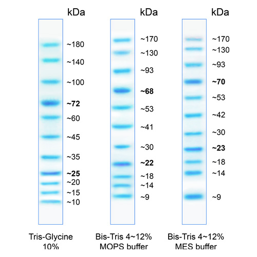 - Broad range: 10-180 kDa (Tris-glycine-SDS running buffer)