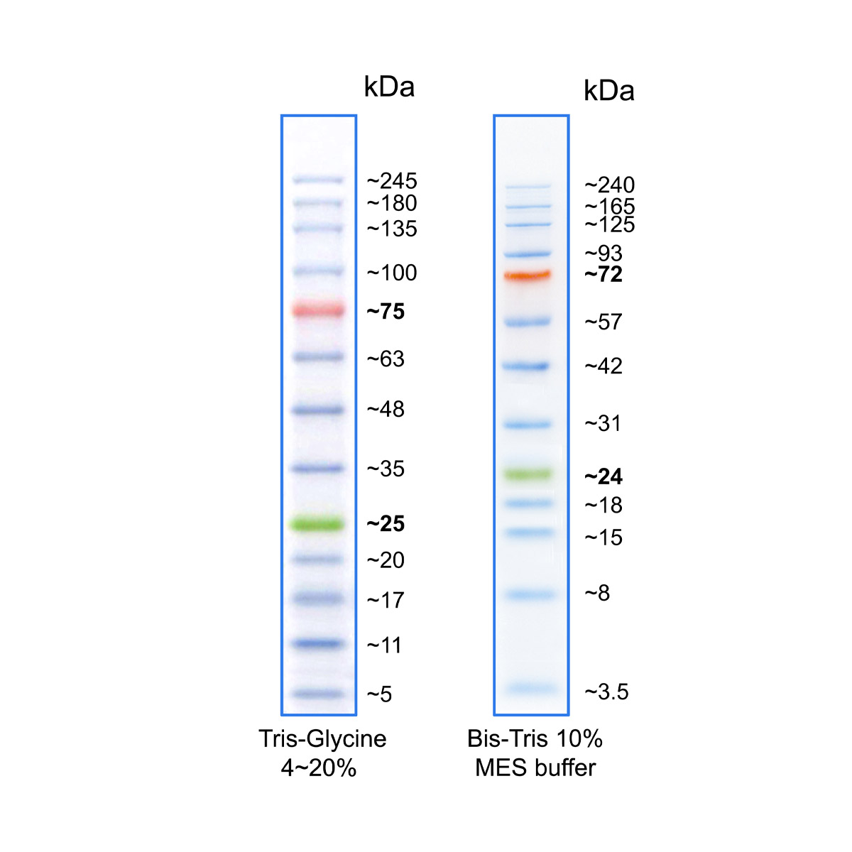 - Easy to identify: includes the ~25, ~75 kDa reference bands coupled with a green and a red dye