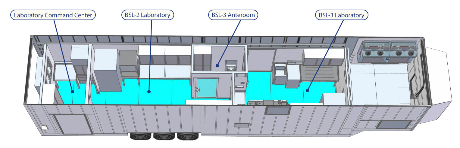 Each mobile facility is engineered and constructed to meet or exceed the CDC NIH BMBL guidelines and the World Health Organization (WHO) guidelines for BSL-3 laboratories.