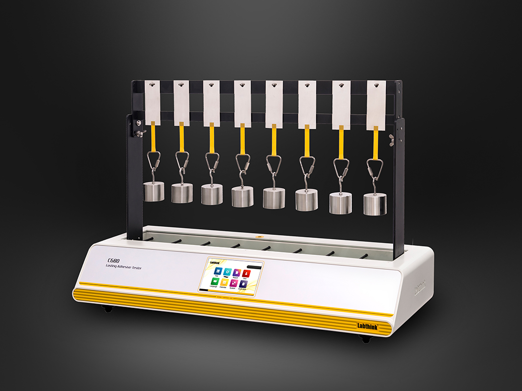 The test plate with adhesive specimen is vertically hanged on the stand and its bottom is attached with a standard weight. The lasting adhesive property can be obtained by measuring the displacement of specimen on vertical test plate or the time to failure at such load.