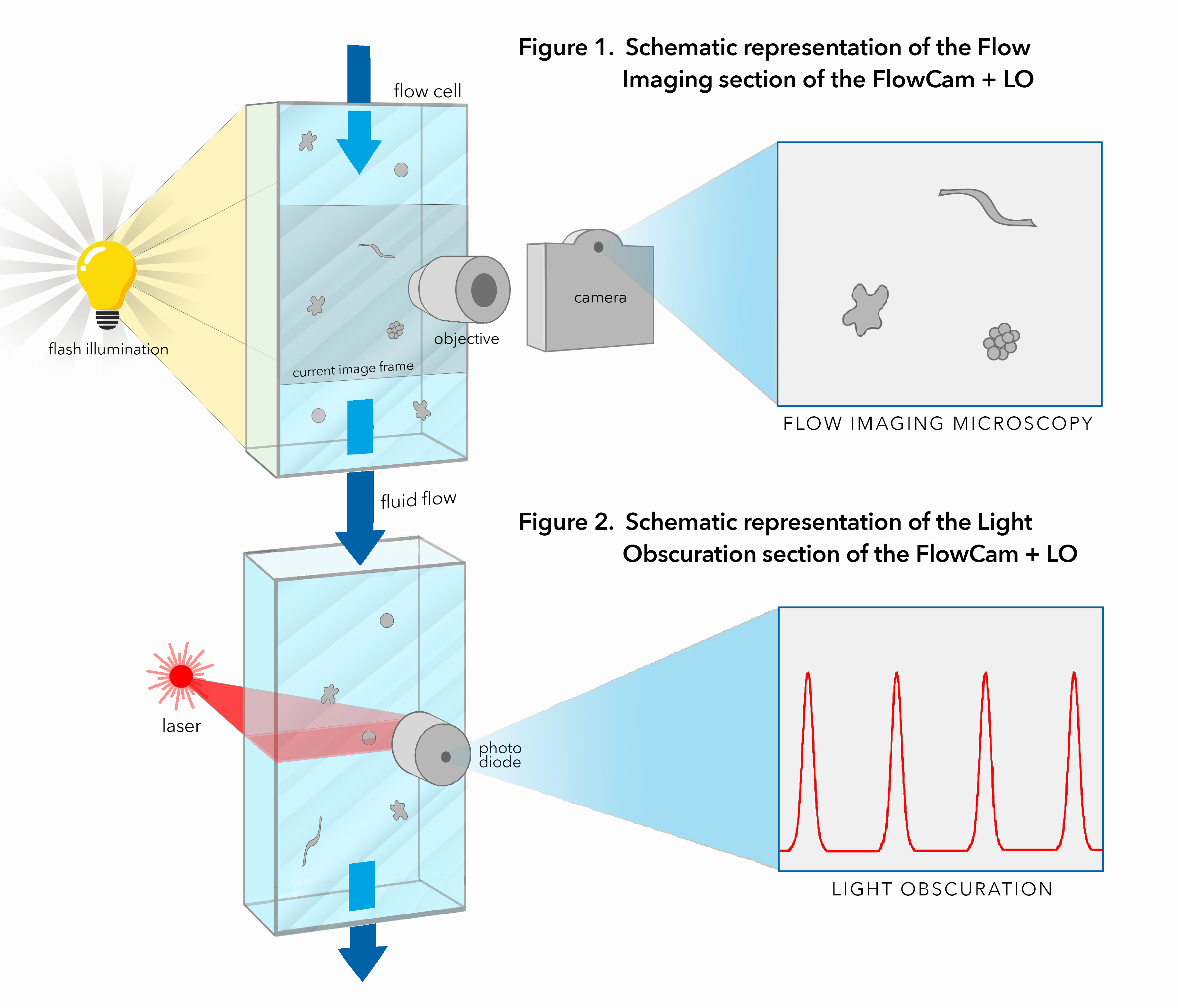 Now, for the first time, you can obtain LO data to meet regulatory requirements, and also verify your data with real images, all with a single instrument, and one sample run. In the FlowCam + LO, a single sample passes continuously through two flow cells. The first uses FlowCam technology to capture digital images, and the second uses a light obscuration module to provide data necessary for USP 787/788 compliance.