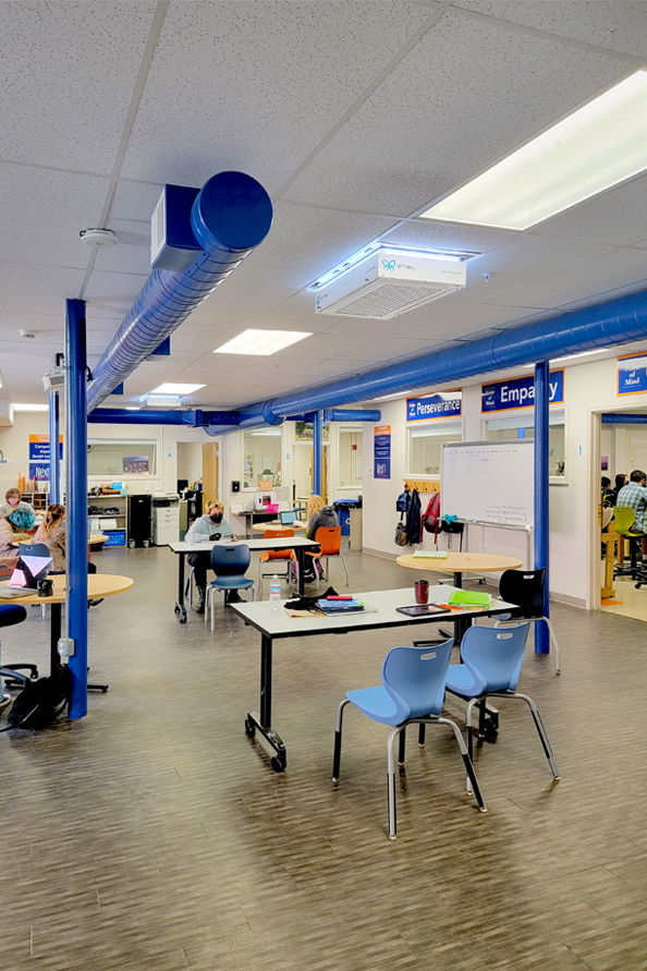 Installing Halo’s throughout your facility provides increased air change rates, improved room mixing, or ventilation effectiveness (VEFF) and 24/7 HEPA filtration. . The Halo provides a permanent infrastructure improvement sustainably without the need for costly upgrades to your HVAC (Heating – Ventilation – Air Conditioning).