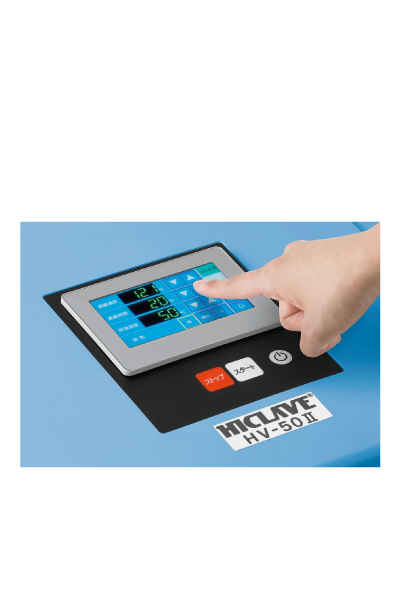 A color touch panel that you can understand the operation at a glance is installed in the best-selling HV series autoclave. A one-touch lock mechanism, an interlock function that detects the pressure and temperature to lock the lid, and a number of functions such as the culture medium dissolution process are also installed as they are. We also offer various options.