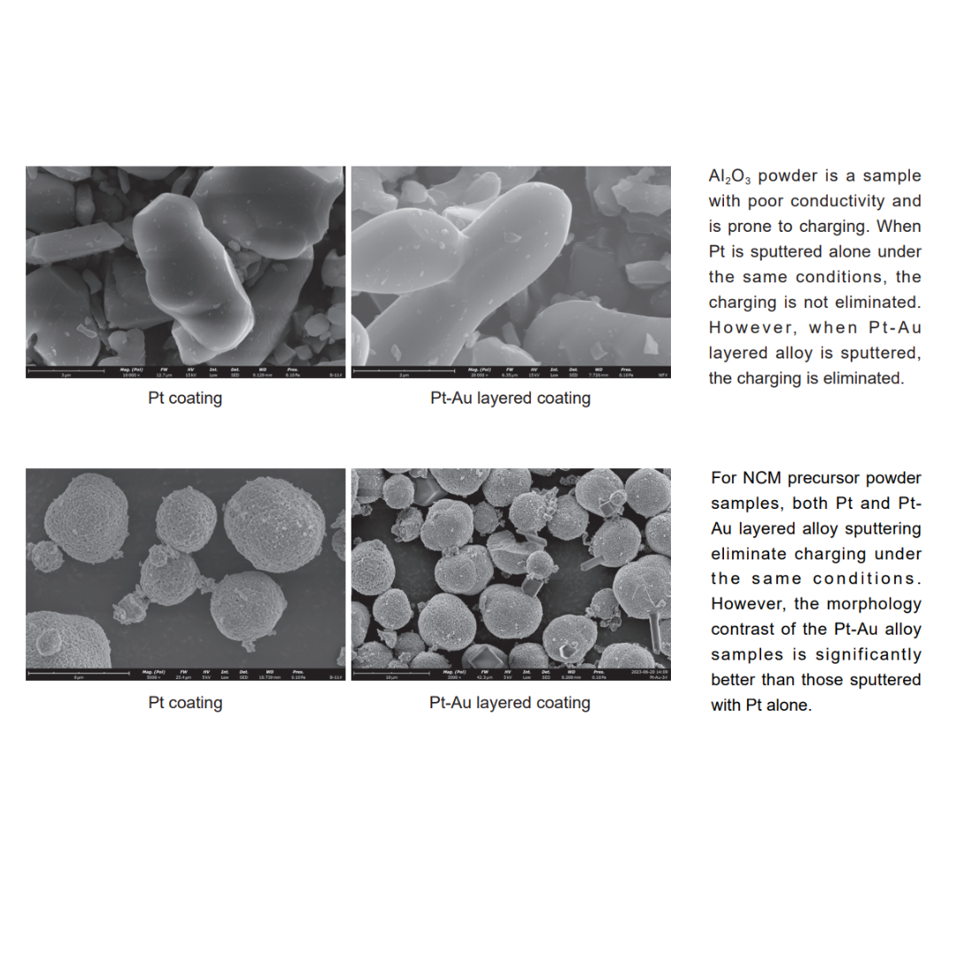 To address this, we have designed a dual-target ion sputter coater and developed a layering process: first sputtering a layer of Pt and then a layer of Au. This layered sputter coating mode effectively suppresses the formation of Au islands. Simultaneously considering conductivity and particle size, it results in excellent charge elimination and contrast enhancement for powder and membrane samples.