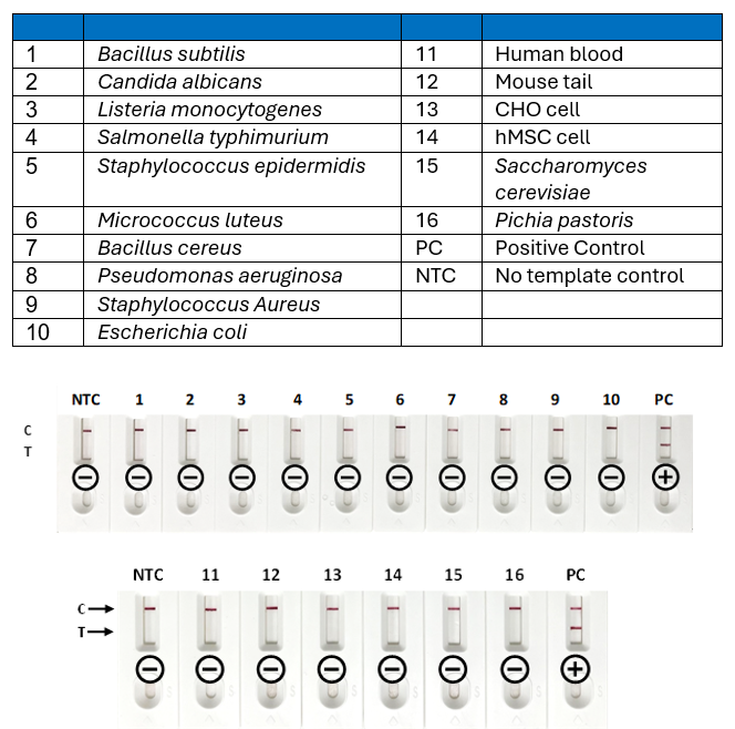 Figure 2: Specificity test of Myco-Visible Mycoplasma Rapid Test Kit. In the upper row, purified gDNA at 1 x 105 copies/reaction from 10 bacteria species that are genetically related to mycoplasma were tested. In the lower row, gDNA isolated from human, mouse, yeast (15,16) as well as uncontaminated cell culture (13,14) were tested. All samples showed a negative result, indicating no cross-reactivity.