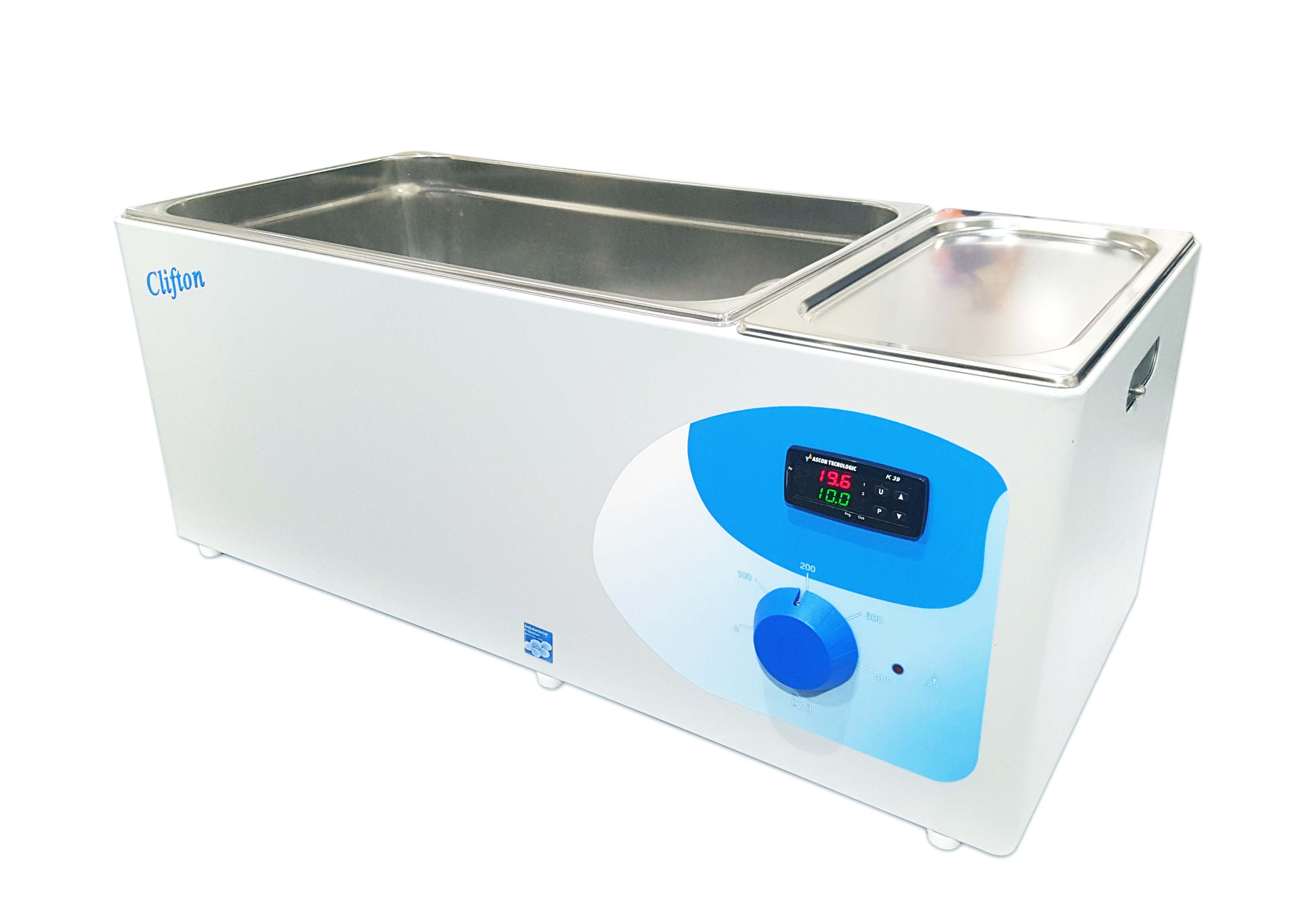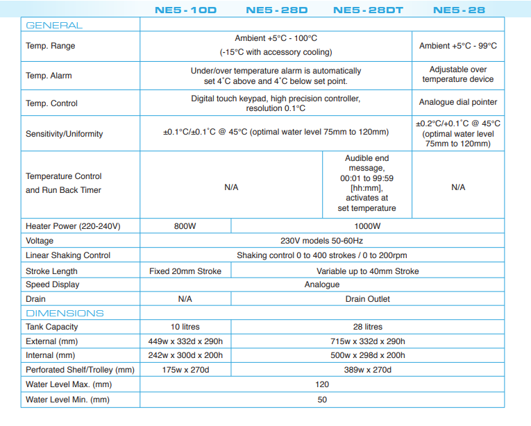 The Clifton NE5-D series of shaking water baths, feature precision PID control, allowing observation of set and actual temperature simultaneously. A broad range of accessory flask clips and racks ensures flexibility for routine and specialised work. NE5-D features bold LED display of measured temperatures in real-time, increments of ±0.1°C, using precision PID temperature control. NE5-28DT has a built in timer, settings variable, 00:01 to 99:59 [hh:mm] which activates at set temperature. Settings retained even after turning the unit off.