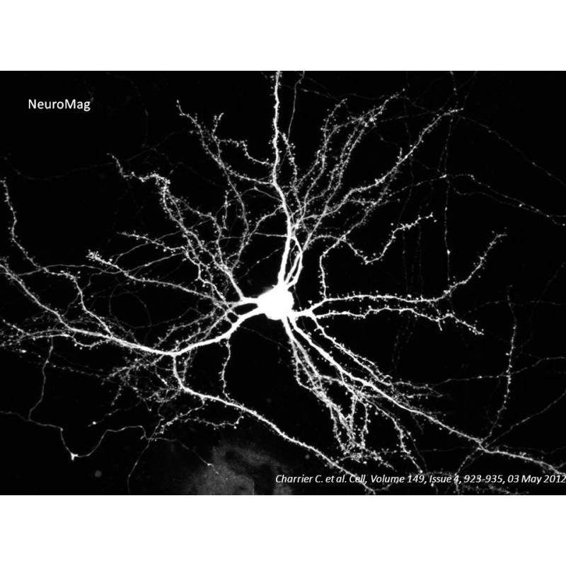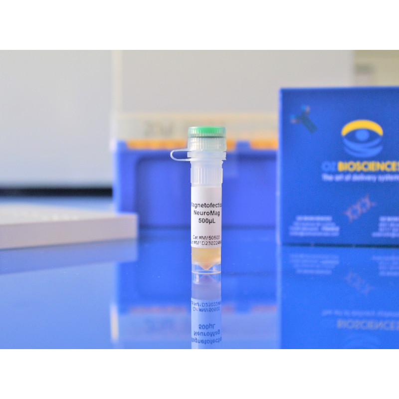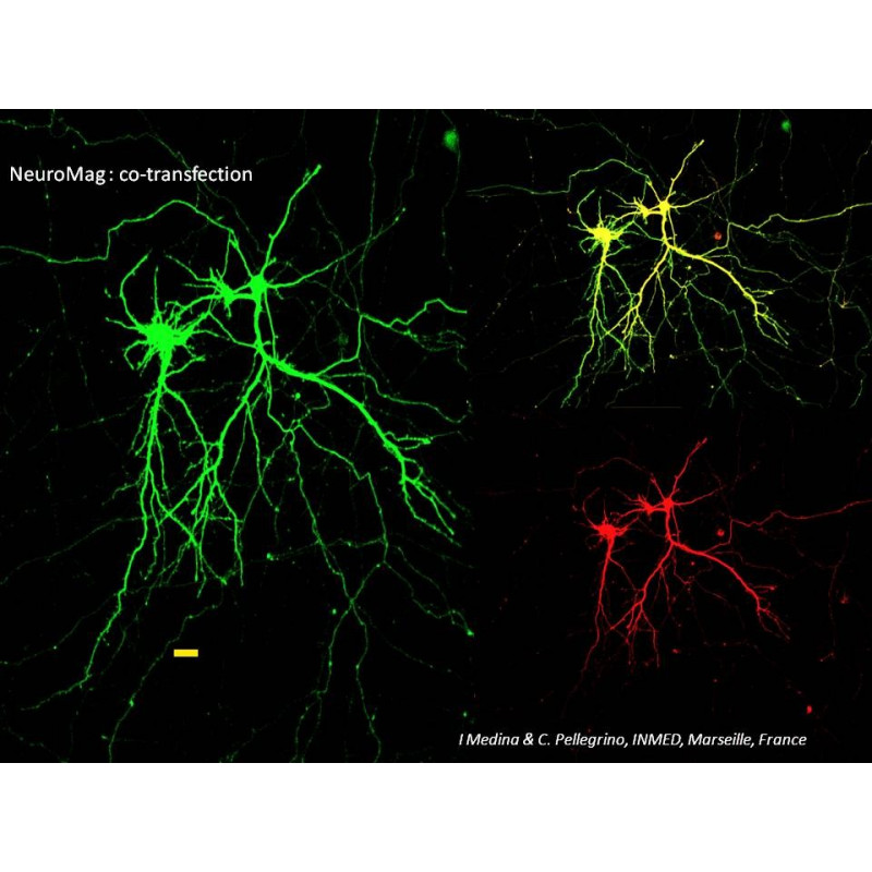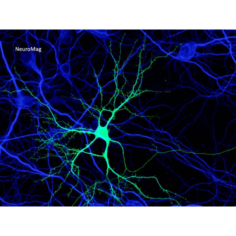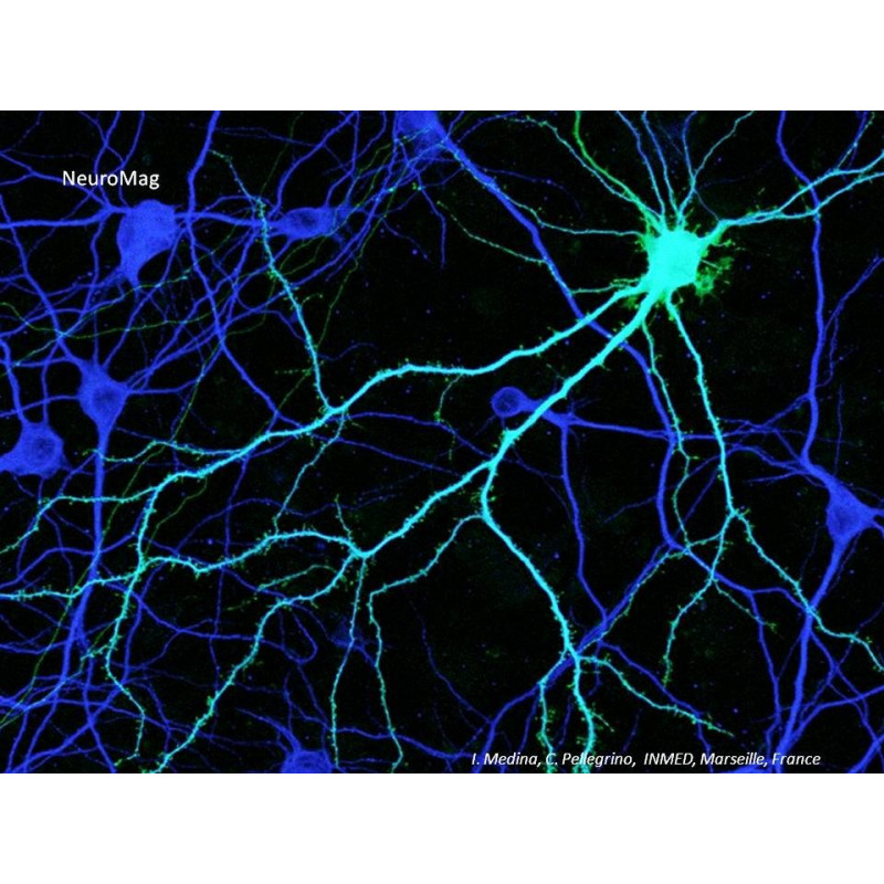 NeuroMag Transfection Reagent is the first dedicated Magnetofection™ transfection reagent for neurons from 1 DIV to 21 DIV. It has proven to be extremely efficient in transfecting a large variety of primary neurons such as cortical, hippocampal, dorsal root ganglion and motor neurons with all types of nucleic acids. Moreover, high transfection efficiency was also achieved in primary astrocytes, oligodendrocyte precursors or neural stem cells as well as other cell lines (C6, B65, PC12, N2A...). Due to its unique properties, NeuroMag allows following transfected neurons during several days.