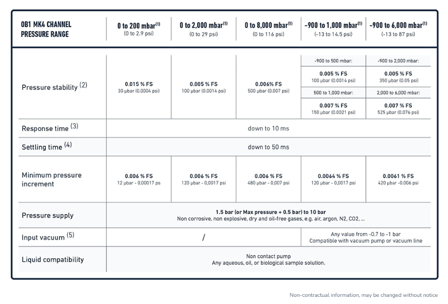 (2) Pressure stability (standard deviation) measured over the full pressure range with an external high accuracy pressure sensor (Druck DPI150) (3) Time required to reach 5% of the setting point. Depends on the computer operating system (4) Time required to reach 95% of the set point. Volume dependent – Measurement was done on 12 mL reservoir for a set point from 0 to 200 mbar (5) A vacuum source is mandatory for calibration and use of dual channels even if the channels are to be used in pressure only.