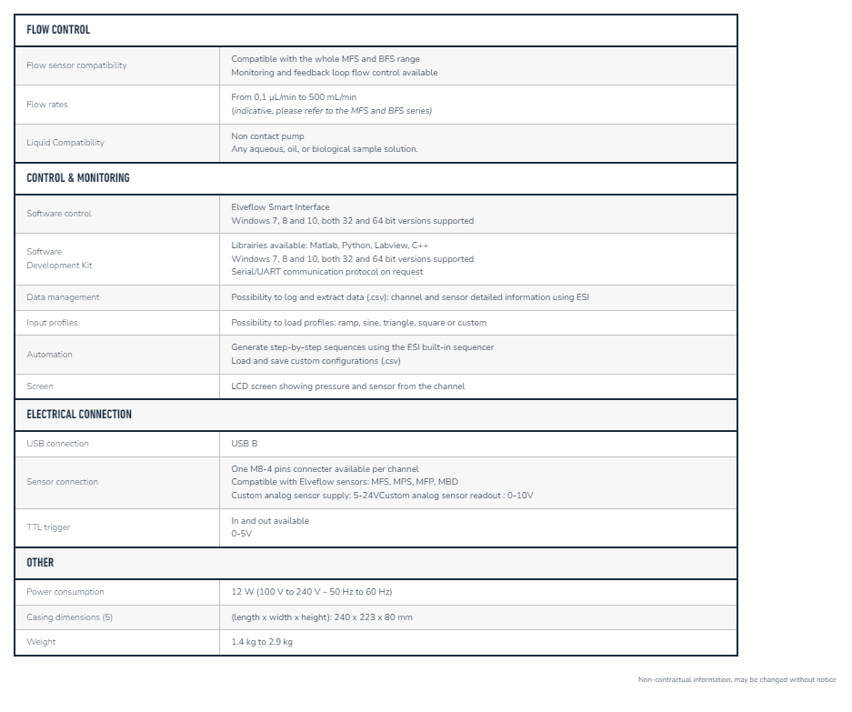 This table summarizes the main specifications of the Elveflow® OB1 MK4 pressure controller. To provide quality & performance, all of our instruments are tested and calibrated independently (response time, stability, repeatability… ) after being assembled and all test results are kept.
