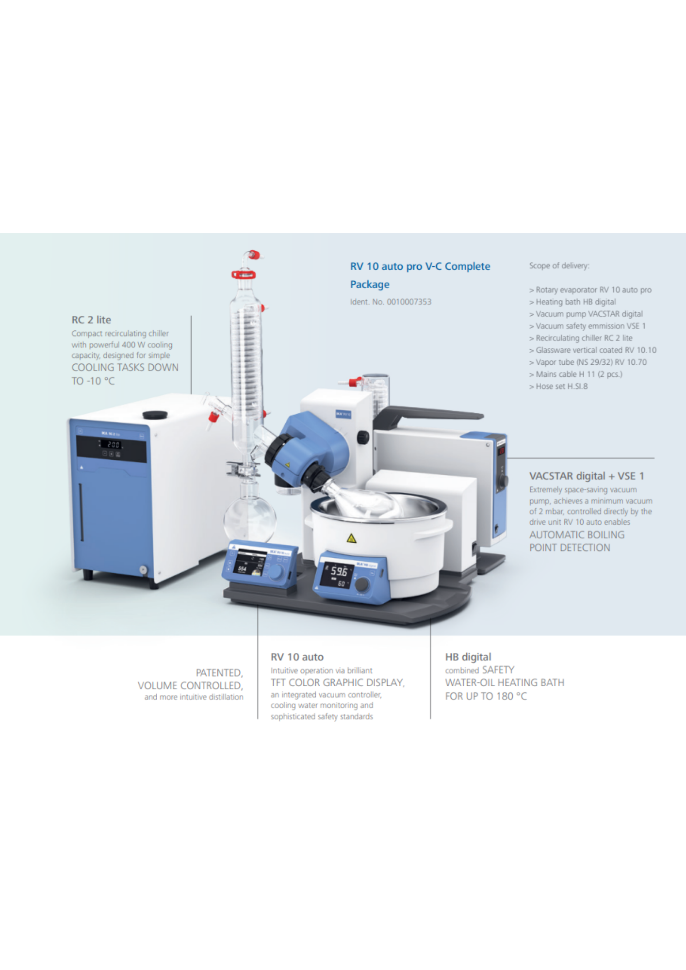 In addition to the rotary evaporator RV 10 auto, the package includes the heating bath HB digital with a capacity of 4 liters, the vacuum pump VACSTAR digital and the recirculating chiller RC 2 lite. All components and connections required for operation are included.
