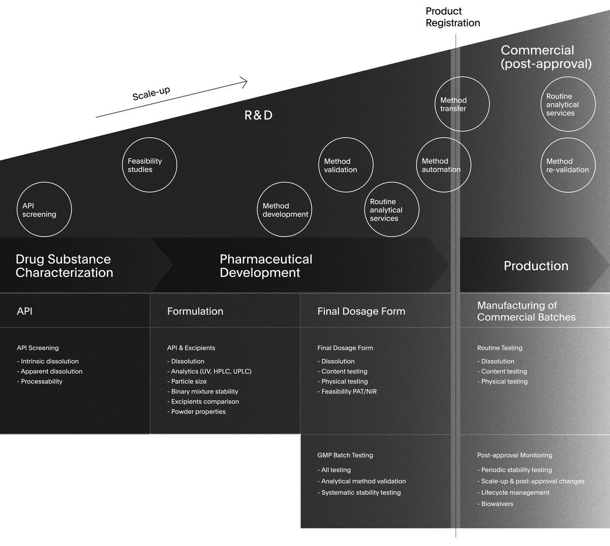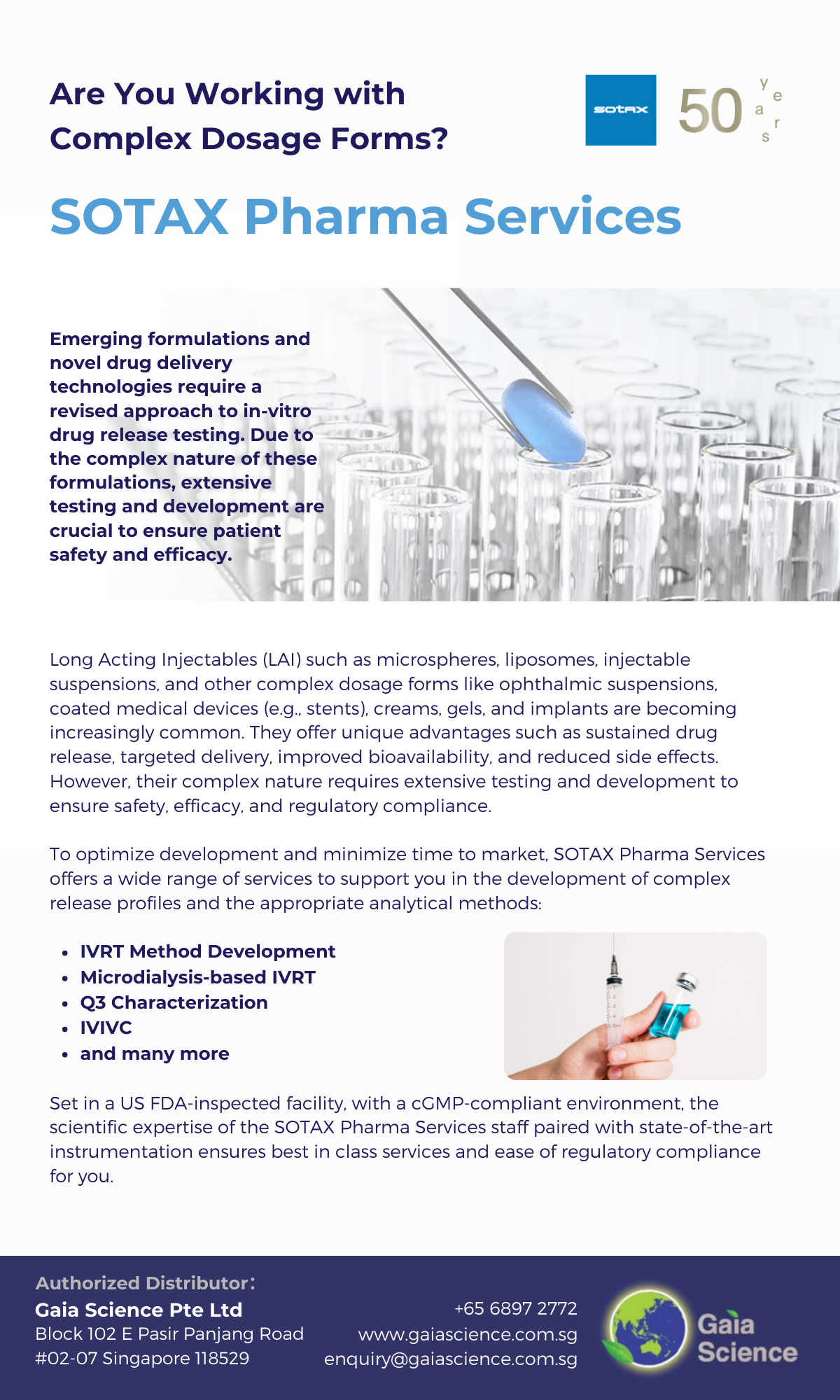Specialized in in vitro dissolution testing, SOTAX Pharma Services team has a proven track record of finding the most suitable method for products ranging from APIs and tablets to implants, semi solids, and many more. Set in a US FDA-inspected facility, with a cGMP-compliant environment with strict quality management processes, the scientific expertise of SOTAX staff paired with state-of-the-art instrumentation ensures best in class services and ease of regulatory compliance for customers.