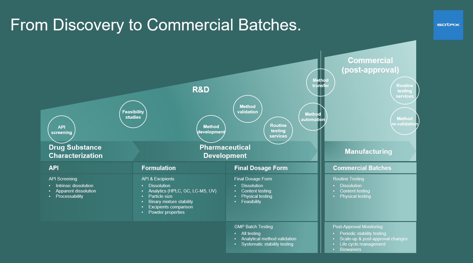 The unique application know-how and experience of the SOTAX Pharma Services team helps pharmaceutical companies worldwide in overcoming the various challenges associated with dissolution and release testing from pharmaceutical dosage forms.