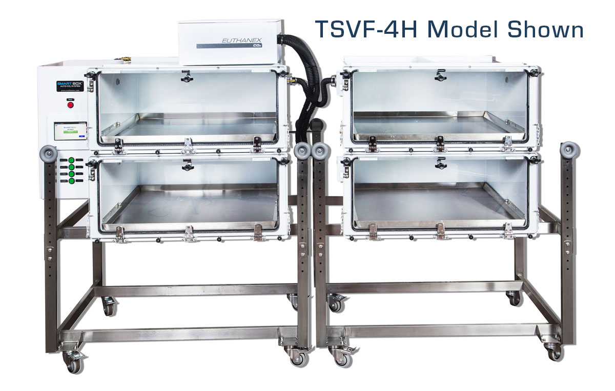 The TSVF-4 automates a three-stage euthanasia cycle by controlling flow rate and timing variables. At start of cycle, doors automatically lock and will not unlock until CO2 evacuation is complete.