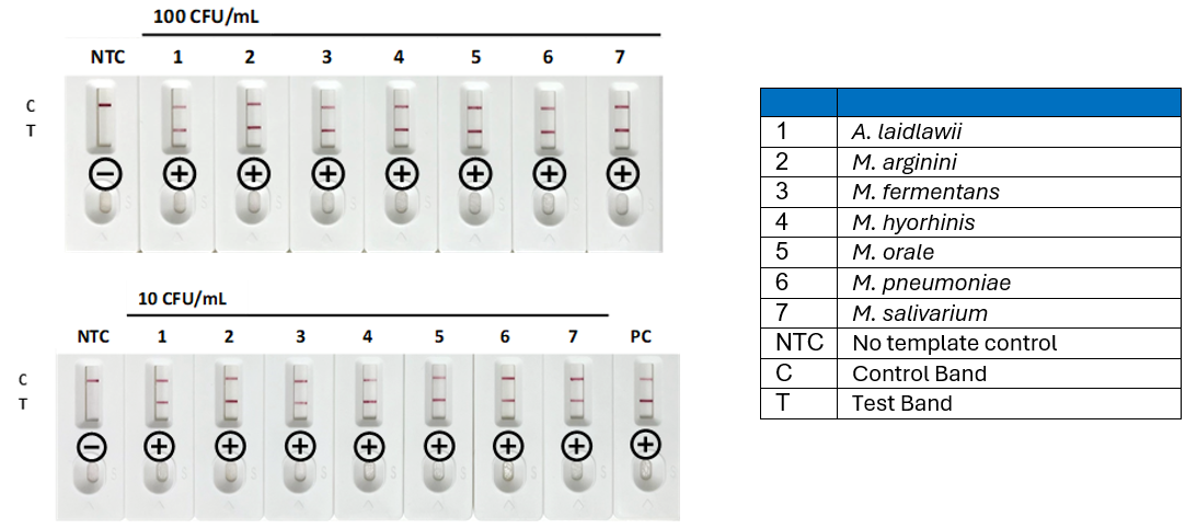 Myco-Visible Mycoplasma Rapid Test Kit has been demonstrated to be a highly sensitive, specific and rapid assay for the detection of mycoplasma contamination in cell cultures. Myco-Visible Mycoplasma Rapid Test Kit achieves this by targeting and amplifying unique regions of the mycoplasma genome at loci that are well conserved in all Mollicutes, including Acholeplasma laidlawii, Mycoplasma arginini, Mycoplasma fermentans, Mycoplasma hominis, Mycoplasma hyorhinis Mycoplasma orale, Mycoplasma salivarium and Mycoplasma pneumoniae. The assay procedure can be completed within 1 hour and the detection limit is as low as 10 Colony-forming Units/mL (CFU/mL) or 10 fg of Mycoplasma genomic DNA per reaction. Specificity test showed no cross-reactivity with other bacterial, fungal and mammalian DNA. The test assay is simple to perform and requires no special technical expertise or lab equipment. Positive results can be visualized on an immunochromatographic test device in less than 5 minutes after sample loading.